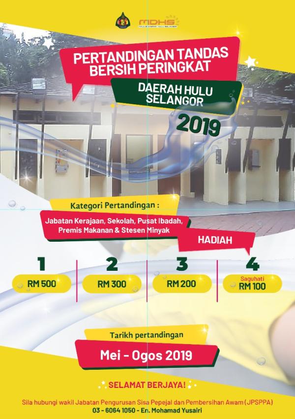 SHAH ALAM, 17 MEI: Majlis Daerah Hulu Selangor (MDHS) menganjurkan Pertandingan Tandas Bersih peringkat Daerah Hulu Selangor 2019 bermula Mei sehingga Ogos ini.