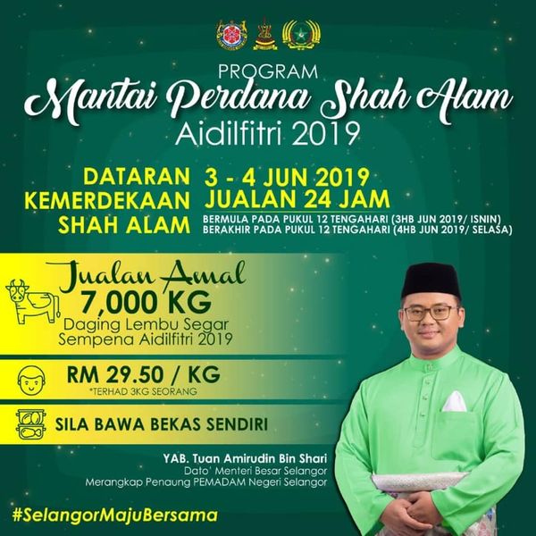“Sempena Aidilfitri yang bakal menjelma, Kerajaan Negeri Selangor melalui Majlis Bandaraya Shah Alam (MBSA) dan Persatuan Mencegah Dadah Malaysia (Pemadam) Negeri Selangor akan menganjurkan program Jualan Amal 7,000 kilogram daging lembu segar.