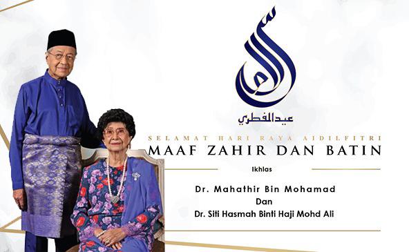 KUALA LUMPUR, 4 JUN: Tun Dr Mahathir Mohamad dan isteri, Tun Dr Siti Hasmah Mohd Ali hari ini mengucapkan selamat menyambut Hari Raya Aidilfitri kepada seluruh rakyat Malaysia yang beragama Islam.
