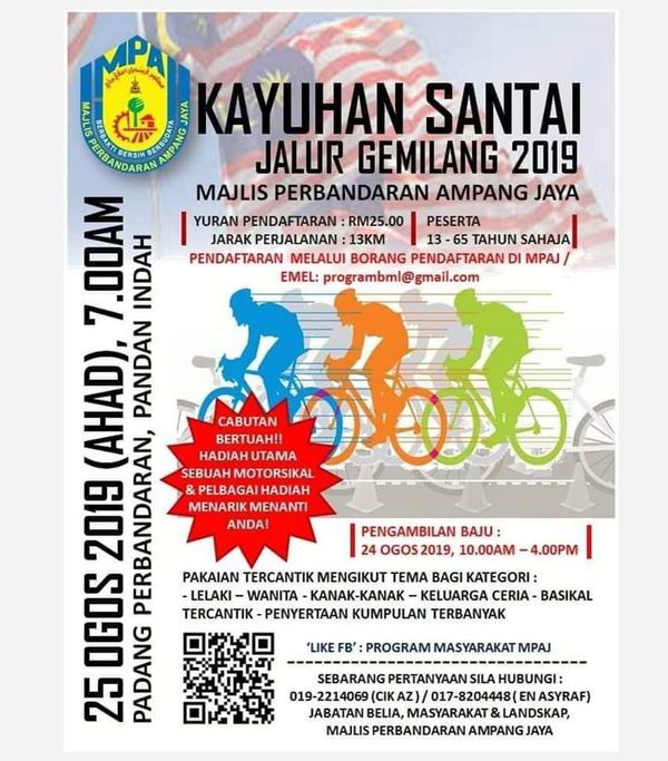 SHAH ALAM, 12 JUN: Majlis Perbandaran Ampang Jaya (MPAJ) menjemput orang ramai untuk menyertai program Kayuhan Santai Jalur Gemilang, pada 25 Ogos ini.