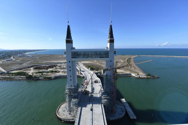 Jambatan angkat pertama di Asia Tenggara sepanjang 638 meter itu mempunyai dua menara berkembar setinggi 16 tingkat.