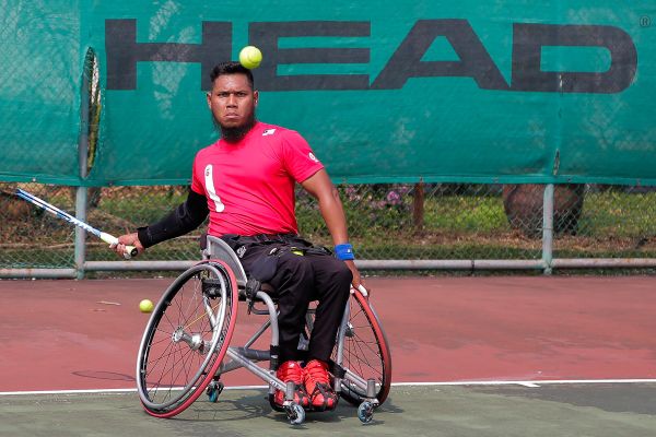Atlet Tennis Kerusi Roda Malaysia Abu Usamah Borhan ketika sesi panas badan sebelum beraksi di Pertandingan Kejohanan Tenis Kerusi Roda Terbuka Persekutuan Tenis Antarabangsa (ITF) Uniqlo Selangor di Kompleks Sukan Kelana Jaya pada 20 Ogos 2019.- Foto HAFIZ OTHMAN/SELANGORKINI