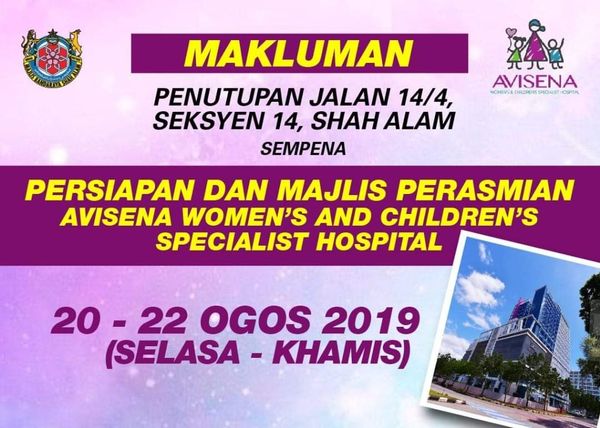 SHAH ALAM, 20 OGOS: Majlis Bandaraya Shah Alam (MBSA) akan menutup sementara sebahagian jalan bagi memberi laluan perasmian Avisena Women’s and Children Specialist Hospital, pada 22 Ogos ini.