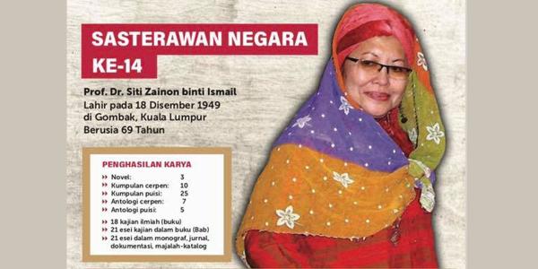 PUTRAJAYA, 3 SEPT: Penulis dan pengkaji budaya terkenal, Prof Dr Siti Zainon Ismail, dipilih sebagai penerima Anugerah Sastera Negara ke-14 yang membawa gelaran Sasterawan Negara ke-14.