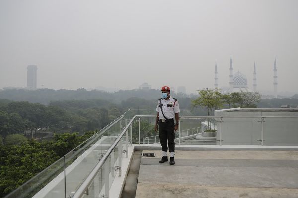 Pengawal Keselamatan Bangunan Ibupejabat PKNS, Shah Alam sedang membuat rondaan sambil memakai topeng mulut dan hidung sebagai langkah keselamatan ekoran keadaan jerebu pada tahap yang tidak sihat pada 13 September 2019.-Foto HAFIZ OTHMAN/SELANGORKINI