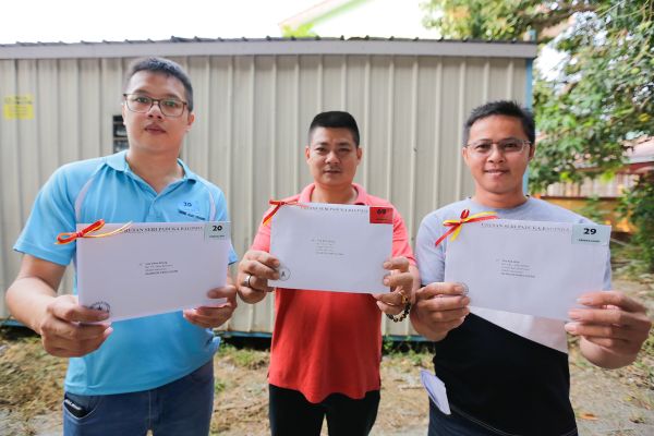 Cha Kok Wah (kanan) Hing Mok Ming (tengah) dan Jason Cheah (kiri) menunjukkan Notis 5A yang di terima ketika Majlis Penyerahan Kelulusan Pemberimilikan Tanah (Notis 5A) di Bagan Sekinchan pada 20 September 2019.-Foto HAFIZ OTHMAN/SELANGORKINI
