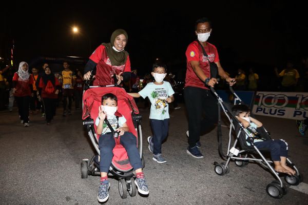 Pasangan ibu bapa sambil membawa anak mereka yang berkereta sorong mengambil bahagian dalam larian Ampang Jaya Night Run 2019 MPAJ di hadapan Melawati Mall, Hulu Klang pada 21 September 2019. – Foto FIKRI YUSOF/SELANGORKINI