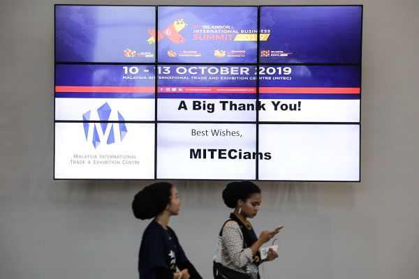 Pengunjung melintasi skrin yang memaparkan poster 3rd Selangor International Business Summit 2019 yang berlansung di MITEC, Kuala Lumpur pada 10 Oktober sehingga hari ini 13 Oktober 2019. Foto FIKRI YUSOF/SELANGORKINI