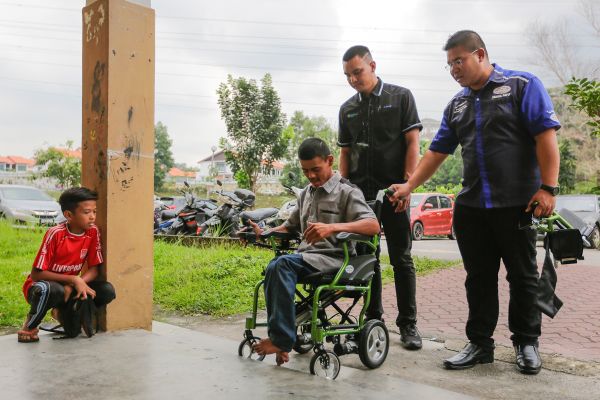 Muhammad Helmi Firdaus mencuba kerusi roda bermotor sumbangan Pemerbadanan Menteri Besar Selangor (MBI) ketika Program CSR Pemerbadanan Menteri Besar Selangor (MBI) di Pangsapuri Enggang, Puchong pada 22 Oktober 2019. Foto HAFIZ OTHMAN/SELANGORKINI