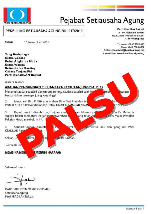SHAH ALAM, 15 NOV: KEADILAN menafikan Setiausaha Agungnya, Datuk Saifuddin Nasution Ismail mengarahkan ahli parti supaya tidak turun mengundi pada Pilihan Raya Kecil (PRK) Tanjung Piai esok seperti yang disebarkan melalui sepucuk surat hari ini.