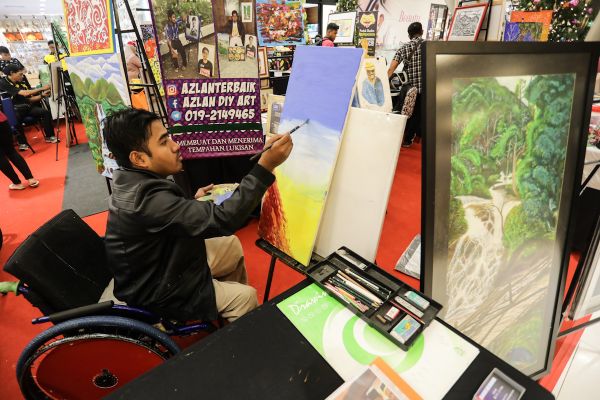 Azlan Yunus, 26 sedang menyiapkan lukisannya ketika Pameran Dan Jualan Lukisan OKU di Da Menn Mall, Subang Jaya. Foto FIKRI YUSOF/SELANGORKINI