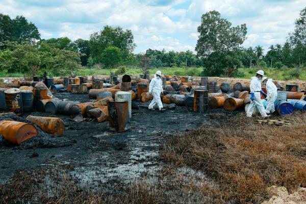 Petugas daripada Kualiti Alam Sdn Bhd melakukan kerja pembersihan di kawasan pembuangan sisa kimia secara haram di Kampung Tambak Jeram, Kuala Selangor. Foto ASRI SAPFIE/SELANGORKINI