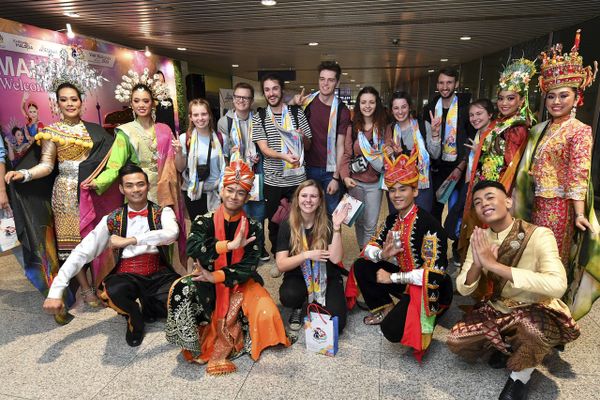 Mohamaddin memberi penghormatan kepada 294 penumpang Etihad Airways yang tiba dari Abu Dhabi dengan memberi kalungan istimewa bertulis #VisitMalaysia2020 serta cenderahati, dan mereka juga disajikan dengan persembahan kebudayaan dari Istana Budaya.