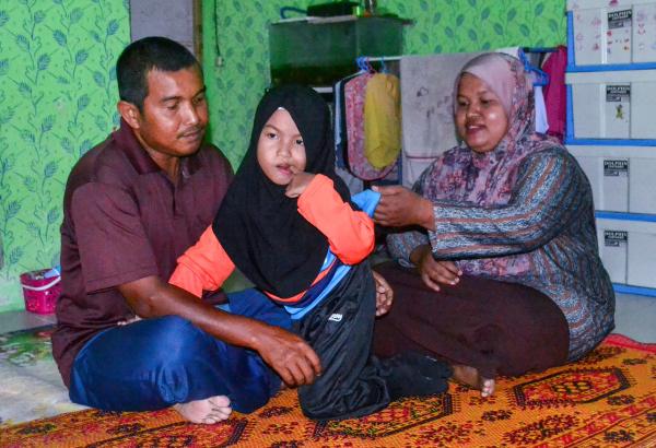 “Saya terpaksa mendukungnya setiap hari untuk masuk ke kelas di tingkat dua,” demikian kata Siti Noraini Shaari yang merayu mana-mana pihak untuk menyumbang kerusi roda dan tongkat bagi memudahkan pergerakan anaknya.