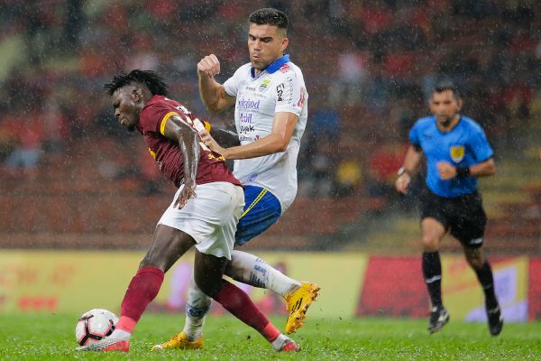 Pemain Selangor, Ifedayo Olusegun (kiri) diasak pemain Persib Bandung, Farbiano Da Rosa dalam Kejohanan Cabaran Asia Selangor (SAC) 2020 di Stadium Shah Alam pada 18 Januari 2020. Foto HAFIZ OTHMAN/SELANGORKINI