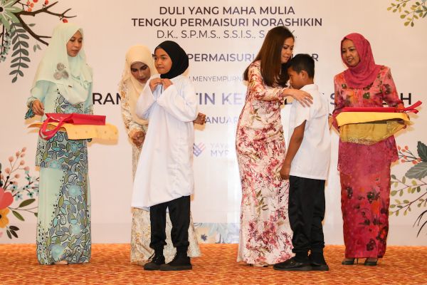 DYMM Tengku Permaisuri Norashikin (tiga dari kiri) berkenan memakaikan seragam kepada pelajar dalam Program Prihatin Kembali Ke Sekolah di Wisma MBSA, Shah Alam pada 19 Januari 2020. Foto FIKRI YUSOF/SELANGORKINI