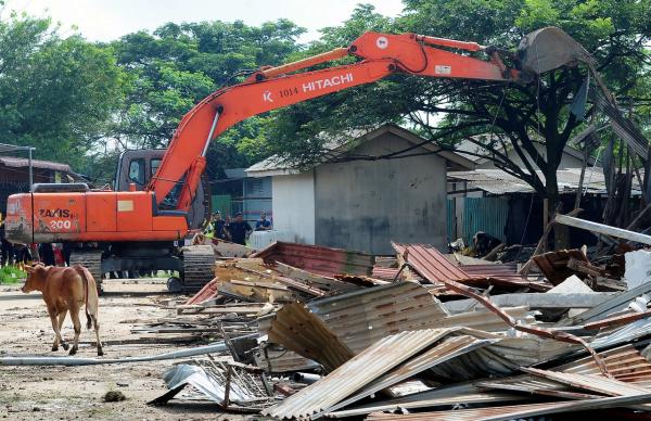 KLANG, 17 FEB: Kerja-kerja perobohan kandang perternakan lembu dan kambing serta binaan kuil di Jalan Rembia 2, Bandar Botanic di sini perlu dilakukan ekoran pemiliknya didapati menceroboh tanah yang dikategorikan sebagai tanah rizab masjid dan rizab sungai.