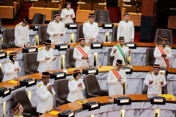 Dato' Menteri Besar Selangor, Dato' Seri Amirudin Shari (hadapan, kanan) bersama Exco Kerajaan Negeri Selangor kelihatan berdoa sebelum Istiadat Pembukaan Persidangan Penggal ketiga Dewan Negeri Selangor di Dewan Negeri Selangor, Shah Alam pada 16 Mac 2020. Foto HAFIZ OTHMAN/SELANGORKINI