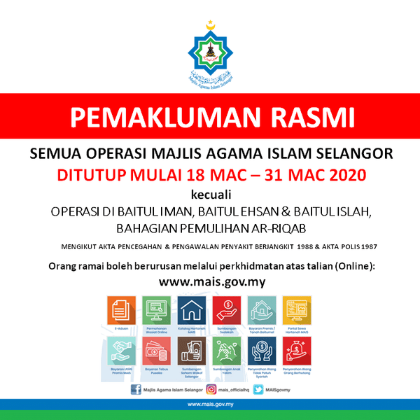 SHAH ALAM, 18 MAC: Majlis Agama Islam Selangor (Mais) menutup operasinya bermula hari ini hingga 31 Mac susulan Perintah Kawalan Pergerakan bagi mencegah penularan Covid-19.