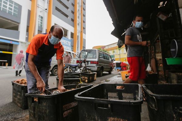 Peniaga santan sibuk membelah buah kelapa bagi memenuhi permintaan pelanggan di Pasar Kajang pada 19 Mac 2020 ketika rakyat Malaysia sedang menjalani Perintah Kawalan Pergerakan bagi mengekang wabak Covid-19. Foto HAFIZ OTHMAN/SELANGORKINI