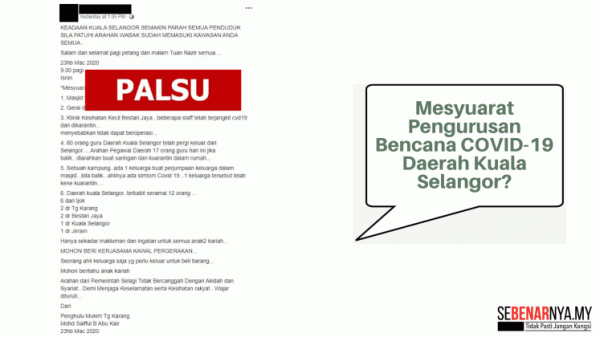 Sebelum ini, tular mesej palsu berhubung enam perkara dibincangkan pada mesyuarat pengurusan bencana Covid-19 di daerah Kuala Selangor.