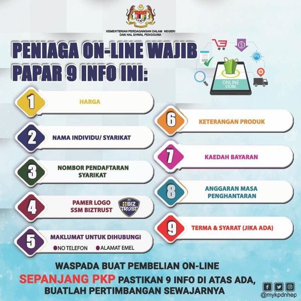 "Waspada buat pembelian sepanjang PKP dan pastikan sembilan info di atas ada, buatlah pertimbangan sewajarnya," tulisnya menerusi hantaran di Twitter @mykpdnhep.