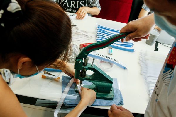 Sukarelawan, Chew See Shin, 45, dibantu isteri menyiapkan pelindung muka di rumah beliau di Seri Kembangan untuk diedarkan kepada petugas hospital dan anggota polis pada 2 April 2020. Foto ASRI SAPFIE/SELANGORKINI