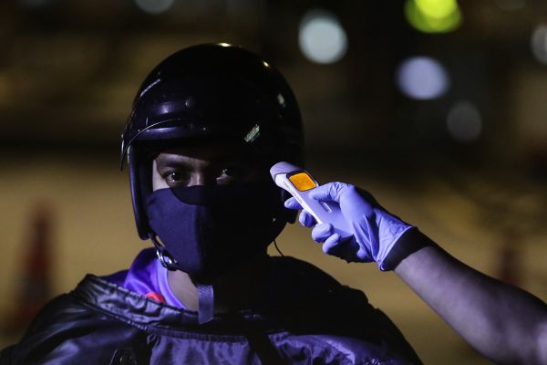 Anggota polis memeriksa suhu badan seorang penunggang motosikal yang melalui sekatan jalan raya di Jalan Ampang pada 5 April 2020 susulan pelaksanaan Perintah Kawalan Pergerakan bagi mengawal penularan wabak Covid-19. Foto FIKRI YUSOF/SELANGORKINI