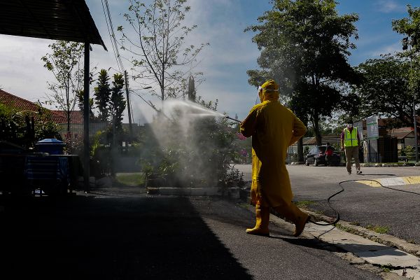 Petugas disinfeksi Majlis Perbandaran Kajang (MPKj) melakukan proses nyahkuman di sekitar Kampung Sungai Kantan, Kajang ketika Ops Sanitasi Awam pada 10, April 2020. Foto HAFIZ OTHMAN/SELANGORKINI