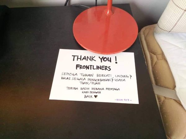 SHAH ALAM, 17 APRIL: Beberapa nota yang menyentuh hati ditinggalkan bekas penghuni pusat kuarantin sekitar Selangor untuk menyatakan penghargaan mereka kepada petugas barisan hadapan.