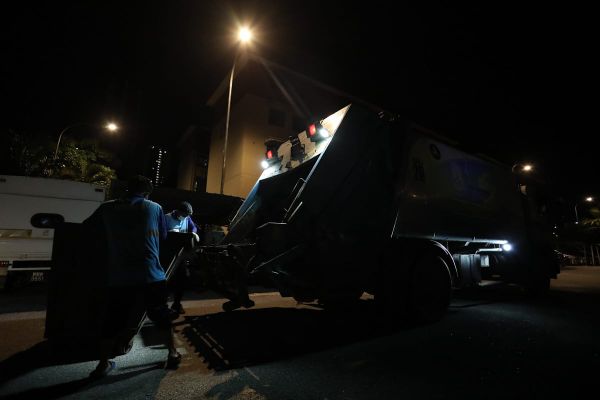 Pekerja pembersihan KDEB Waste Management (KDEBWM) mengutip sampah dan sisa pepejal sewaktu Perintah Kawalan Pergerakan Bersyarat (PKPB) bagi membendung wabak Covid-19 di sekitar Pandan Jaya pada awal pagi 10 Mei 2020. Foto FIKRI YUSOF/SELANGORKINI