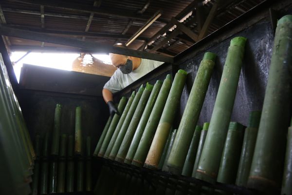 Pembantu peniaga Lemang Uda menyusun batang lemang di dalam ketuhar sebelum dibakar ketika ditemui di gerainya di Pekan Semenyih, Hulu Langat pada 17 Mei 2020. Foto REMY ARIFIN/SELANGORKINI