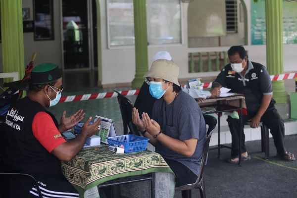 Amil Surau Al-Falah Pandan Jaya membacakan doa selepas menerima wang zakat fitrah dengan mematuhi peraturan sepanjang tempoh Perintah Kawalan Pergerakan Bersyarat (PKPB) seperti menjaga penjarakan sosial dan larangan berkumpul di Pandan Jaya pada 21 Mei 2020. Foto HAFIZ OTHMAN/SELANGORKINI