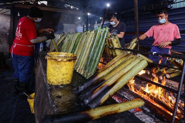Pembuat lemang sedang memeriksa lemang yang dibakar agar masak sempurna sebelum dijual kepada pelanggan sempena sambutan Hari Raya Aidilfitri di Gerai Pak Ajai Lemang Kemensah, Ampang pada 25 Mei 2020 mereka juga turut mengekalkan jarak sosial serta memakai pelitup muka bagi mengikut Prosedur Operasi Standard (SOP) berikutan Perintah Kawalan Pergerakan Bersyarat (PKPB) bagi mengawal penularan Covid-19. Foto HAFIZ OTHMAN/SELANGORKINI