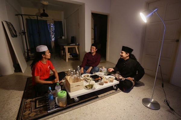 Tiga teman serumah Hadi Surahmat (tengah), Wan ZulHilmi Wan Adnan (kanan) dan Akmal Ersal (kiri) buat pertama kali tidak dapat beraya di kampung dan menyambut Hari Raya Aidilfitri secara bersederhana di kediaman mereka di Keramat, Kuala Lumpur pada 25 Mei 2020 berikutan Perintah Kawalan Pergerakan Bersyarat (PKPB) bagi mengawal penularan Covid-19. Foto HAFIZ OTHMAN/SELANGORKINI