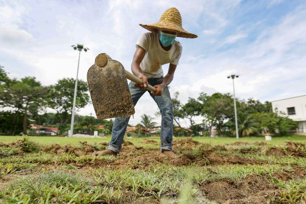 Pekerja kontraktor pembersihan sedang melakukan kerja-kerja penyelenggaraan baik pulih padang bola sepak di Seksyen 4, Shah Alam pada 5 Jun 2020. Foto HAFIZ OTHMAN/SELANGORKINI