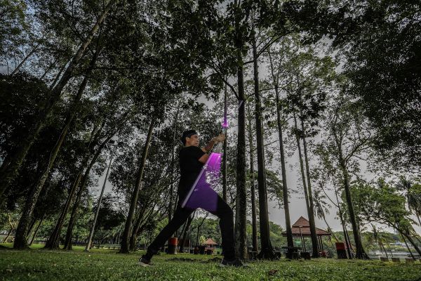 Amer Alif, 23 melakukan aktiviti riadah dengan bermain pedang cahaya atau 'Lightsaber' di Taman Tasik Shah Alam pada 5 Jun 2020. Foto FIKRI YUSOF/SELANGORKINI