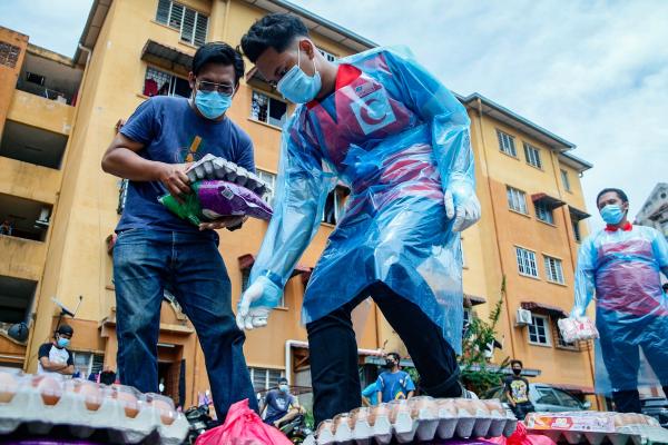 Sukarelawan Bulan Sabit Merah daerah Sepang mengagihkan keperluan barangan asas kepada penduduk di Pangsapuri Taman Langat Utama, Kuala Langat yang dikenakan Perintah Kawalan Pergerakan (PKP) Pentadbiran pada 7 Jun 2020. Foto ASRI SAPFIE/SELANGORKINI