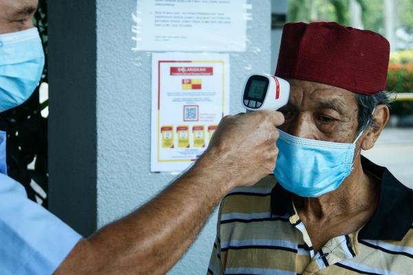 Petugas memeriksa suhu badan seorang warga emas sebelum dibenarkan memasuki bangunan pentadbiran Pejabat Daerah Hulu Langat, Bangi pada 9 Jun 2020. Foto ASRI SAPFIE/SELANGORKINI