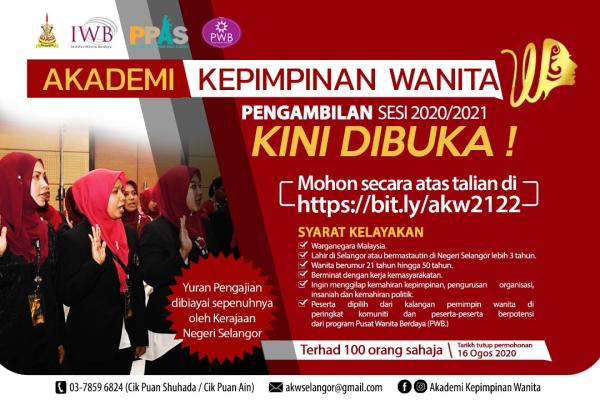 SHAH ALAM, 18 JULAI: Wanita berusia 21 hingga 50 tahun dipelawa menyertai Akademi Kepimpinan Wanita bagi sesi pengambilan 2020/2021.