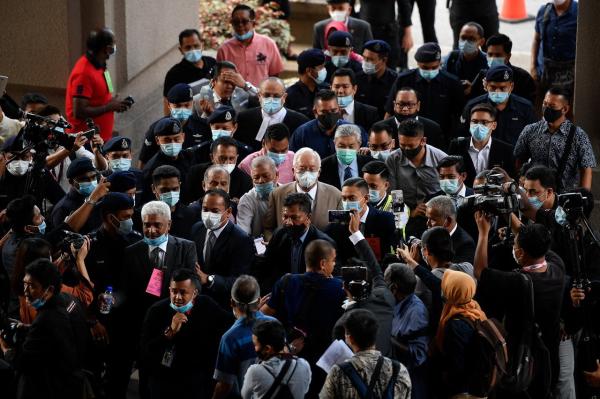 Polis dilihat menggunakan pembesar suara untuk memaklumkan orang ramai yang hadir di luar kawasan pagar mahkamah supaya mematuhi prosedur operasi standard (SOP) dan memakai pelitup muka bagi mencegah penularan pandemik Covid-19.