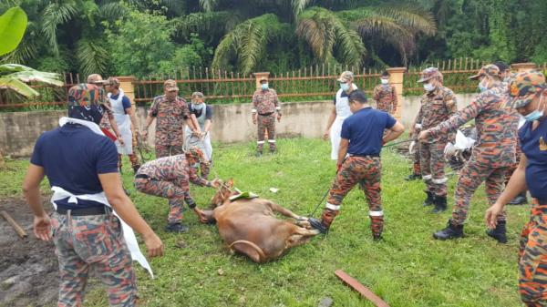 Pagi tadi, Salimun menyempurnakan proses menyembelih empat ekor lembu sumbangan Pertubuhan Pusat Pemulihan Dalam Komuniti Bandar Botanic di Balai Bomba dan Penyelamat Pelabuhan Klang.