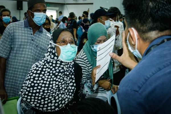 Maziah Abdul Ghani, 70 menyerahkan borang permohonan permit penjaja sementara kepada petugas Jabatan Perlesenan Majlis Bandaraya Shah Alam (MBSA) ketika program penyusunan semula peniaga dan penjaja Bandar Baru Sungai Buloh memudahkan permohonan permit di Dewan Meranti, Sungai Buloh pada 15 Ogos 2020. Foto ASRI SAPFIE/SELANGORKINI