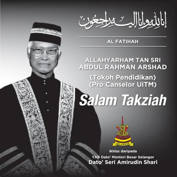 SHAH ALAM, 16 OGOS: Dato’ Menteri Besar menyampai ucapan takziah kepada keluarga tokoh pendidikan negara Allahyarham Tan Sri Dr Abdul Rahman Arshad yang meninggal dunia hari ini.