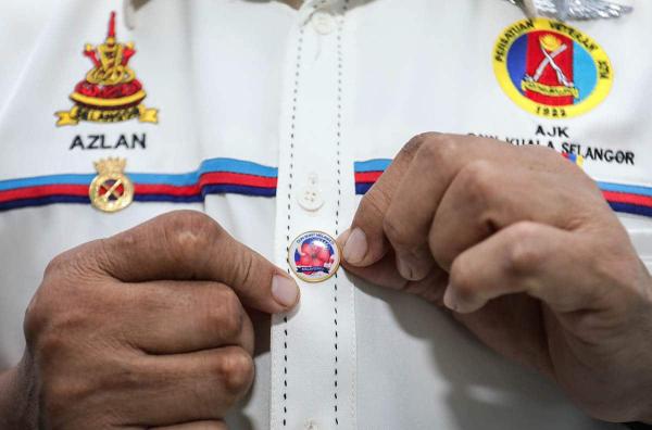 Seorang ahli Persatuan Veteran Angkatan Tentera Malaysia (PVATM) Cawangan Kuala Selangor mengenakan Pin Merdeka ketika pelancaran kempen jualannya di Bangunan SUK Selangor, Shah Alam pada 26 Ogos 2020 bagi mengumpul dana membantu ahli persatuan yang memerlukan. Foto FIKRI YUSOF/SELANGORKINI