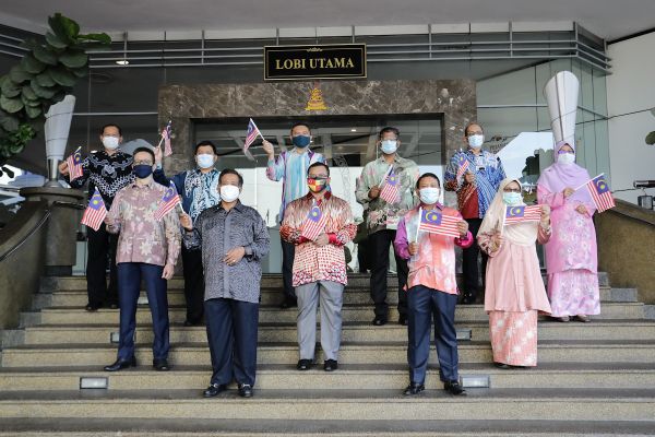 Dato Menteri Besar, Dato' Seri Amirudin Shari bersama barisan EXCO serta pengawai kanan pengurusan tertinggi Kerajaan Negeri megibarkan Jalur Gemilang di lobi utama Bangunan Sultan Salahuddin Abdul Aziz Shah, Shah Alam pada 27 Ogos 2020. Foto FIKRI YUSOF/SELANGORKINI