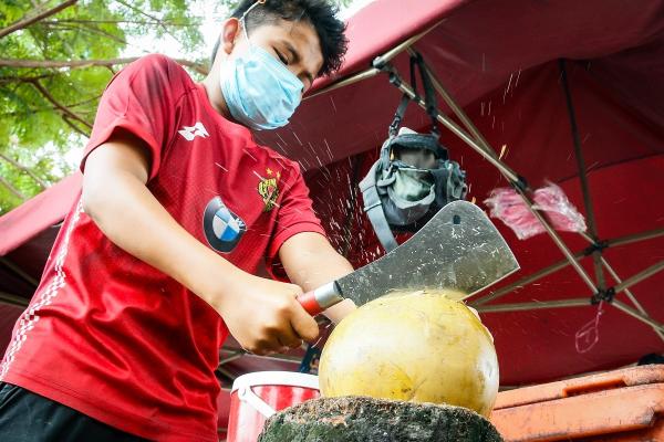 Shamirul Iqbal Samsir, 12, menghabiskan cuti hujung minggu dengan membantu bapanya memotong kelapa muda di tapak penjaja sementara di Bandar Baru Sungai Buloh, Shah Alam untuk menyiapkan tempahan pelanggan pada 5 September 2020. Foto ASRI SAPFIE/SELANGORKINI
