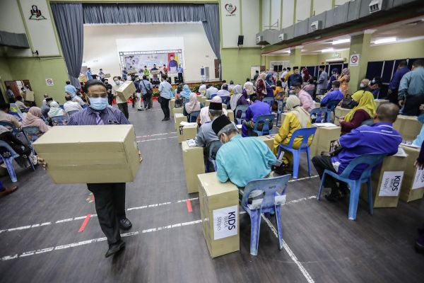 Para guru menerima kotak mengandungi pelitup muka boleh guna semula dalam program Penyerahan Pelitup Muka Percuma Kepada Sekolah Daerah Gombak di Dewan Sri Siantan, Selayang pada 11 September 2020 untuk diedar kepada 120,000 pelajar membabit 104 sekolah di daerah itu. Foto FIKRI YUSOF/SELANGORKINI