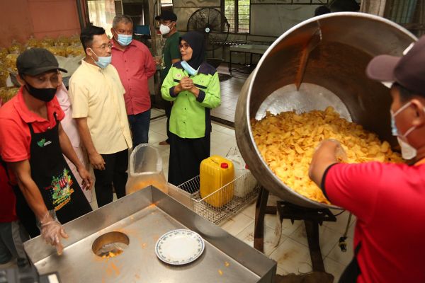 ADN Tanjung Sepat Borhan Aman Shah bersama ADN Morib Hasnul Baharuddin meninjau proses pembuatan kerepek ubi ketika di kilang Ani Biskut, Sepang pada 19 September 2020. Foto REMY ARIFIN/SELANGORKINI
