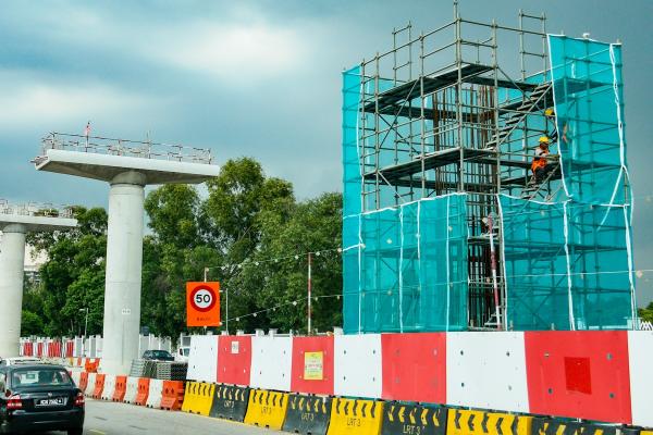 Kerja pemasangan jaring keselamatan dilakukan sebagai langkah berjaga-jaga di kawasan tapak pembinaan transit aliran ringan (LRT 3) di Persiaran Kerjaya, Shah Alam pada 21 September 2020. Foto ASRI SAPFIE/SELANGORKINI